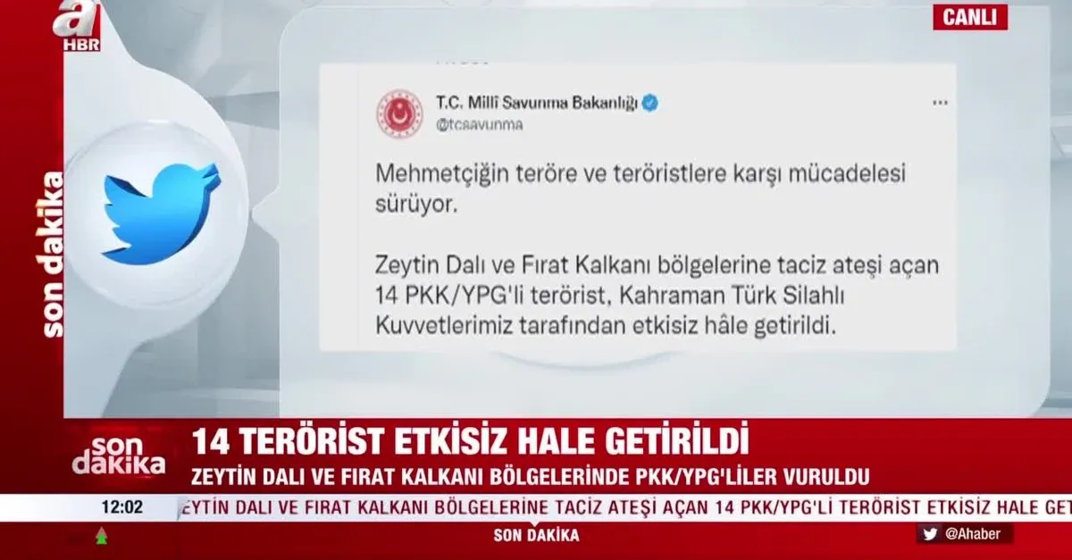 Son dakika... MSB'den yapılan açıklamada, "Mehmetçiğin teröre ve teröristlere karşı mücadelesi sürüyor. Zeytin Dalı ve Fırat Kalkanı bölgelerine taciz ateşi açan 14 PKK/YPG'li terörist, Kahraman Türk Silahlı Kuvvetlerimiz tarafından etkisiz hâle getirildi." denildi.