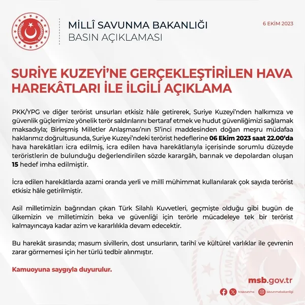 Milli Savunma Bakanlığı (MSB), Türk Silahlı Kuvvetleri'nin (TSK) Suriye'nin kuzeyinde düzenlediği hava harekatında teröristlerin kullandığı sözde karagah, barınak ve depolardan oluşan 15 hedefin imha edildiğini açıkladı.