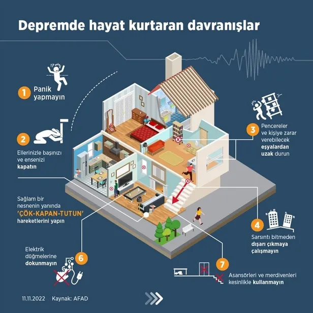 Tatbikat kapsamında, mesajın duyulması halinde güvenli görülen bir yerde, sağlam bir nesnenin yanında ya da altında çökülecek. Sırt, pencerelere dönük şekilde kapanılacak, baş ve boyun, düşme ihtimali olan cisimlerden korunacak. Sarsıntı sona erene kadar, yatak veya oturma grubu gibi ağır ve büyük eşyalara tutunup beklenecek.