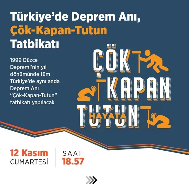 Afet ve Acil Durum Yönetimi (AFAD) Başkanı Yunus Sezer, yaptığı açıklamada, 12 Kasım 1999 Düzce depreminin yıl dönümü dolayısıyla saat 18.57'de ülke genelinde yapılacak "çök kapan tutun" tatbikatı hazırlıkları hakkında bilgi verdi.