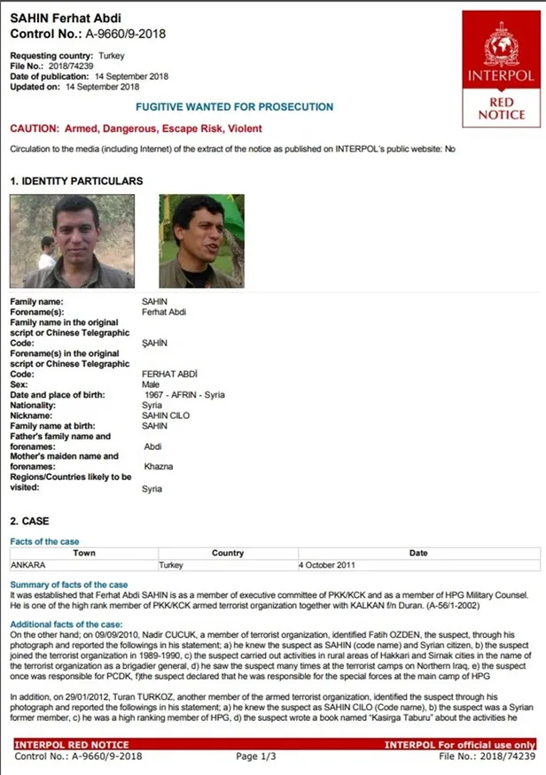 Türkiye'de 9 karakol saldırısıyla suçlanan Ferhad Abdi Şahin için 2011'de kırmızı bülten çıkartılmıştı. İçişleri Bakanlığı'nın terörden arananlar listesinde kırmızı kategoride bulunan terörist, 4 milyon lira ödülle aranıyor. Terörist başı Abdullah Öcalan'ın birçok kanlı eylemin emrini veren Şahin hakkında "manevi oğlum" dediği biliniyor.