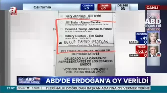 ABD'de yapılan Başkanlık Seçimlerinde sandıktan 'Erdoğan' çıktı. New York'ta kurulan sandıkta oy kullanan bir ABD vatandaşı oy pusulasına 'Recep Tayyip Erdogan' yazarak Erdoğan sevgisini ortaya koydu. ABD'de yapılan seçimlerde bile Türkiye izi ve Erdoğan sevgisi bir kez daha görülmüş oldu..