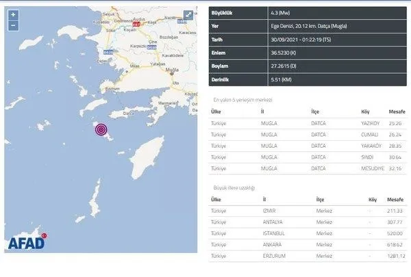 AFAD tarafından yapılan son dakika açıklamasında Muğla'nın Datça ilçesinde 4.3 büyüklüğünde depremin meydana geldiği açıklandı.