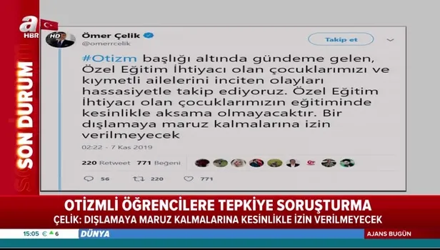 Aksaray'da özel eğitim sınflarının kapatılmasını isteyen velilerin otizmli öğrencileri yuhalaması hakkında Twitter hesabından açıklamalarda bulunan AK Parti Sözcüsü Ömer Çelik, "Özel eğitim ihtiyacı olan çocuklarımızın eğitiminde kesinlikle aksama olmayacaktır. Bir dışlamaya maruz kalmalarına izin verilmeyecek." ifadesini kullandı.