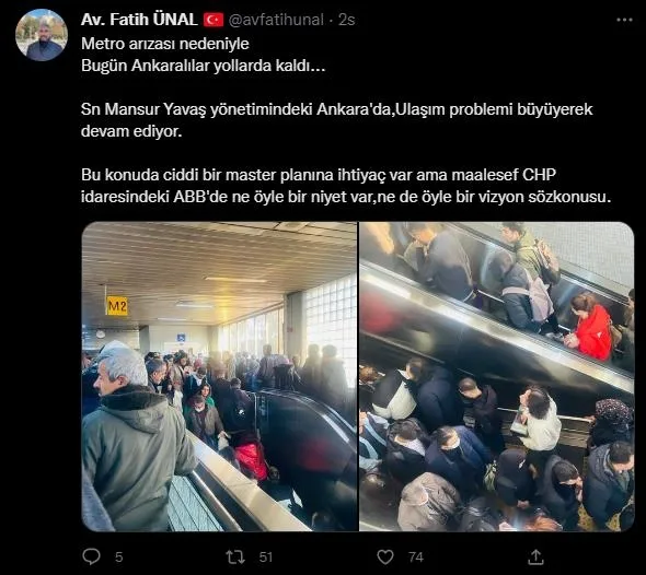 Ankara Büyükşehir Belediye (ABB) Meclisi Birinci Başkanvekili Fatih Ünal, "Metro arızası nedeniyle bugün Ankaralılar yollarda kaldı... Sayın Mansur Yavaş yönetimindeki Ankara'da, ulaşım problemi büyüyerek devam ediyor. Bu konuda ciddi bir master planına ihtiyaç var ama maalesef CHP idaresindeki ABB'de ne öyle bir niyet var, ne de öyle bir vizyon sözkonusu." dedi.