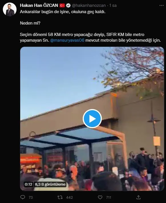 Yavaş'a tepki gösteren AK Parti Ankara İl Başkanı Hakan Han Özcan: "Ankaralılar bugün de işine, okuluna geç kaldı. Neden mi? Seçim dönemi '58 kilometre metro yapacağız' deyip, sıfır kilometre bile metro yapamayan Sayın Mansur Yavaş mevcut metroları bile yönetemediği için." ifadelerini kullandı.