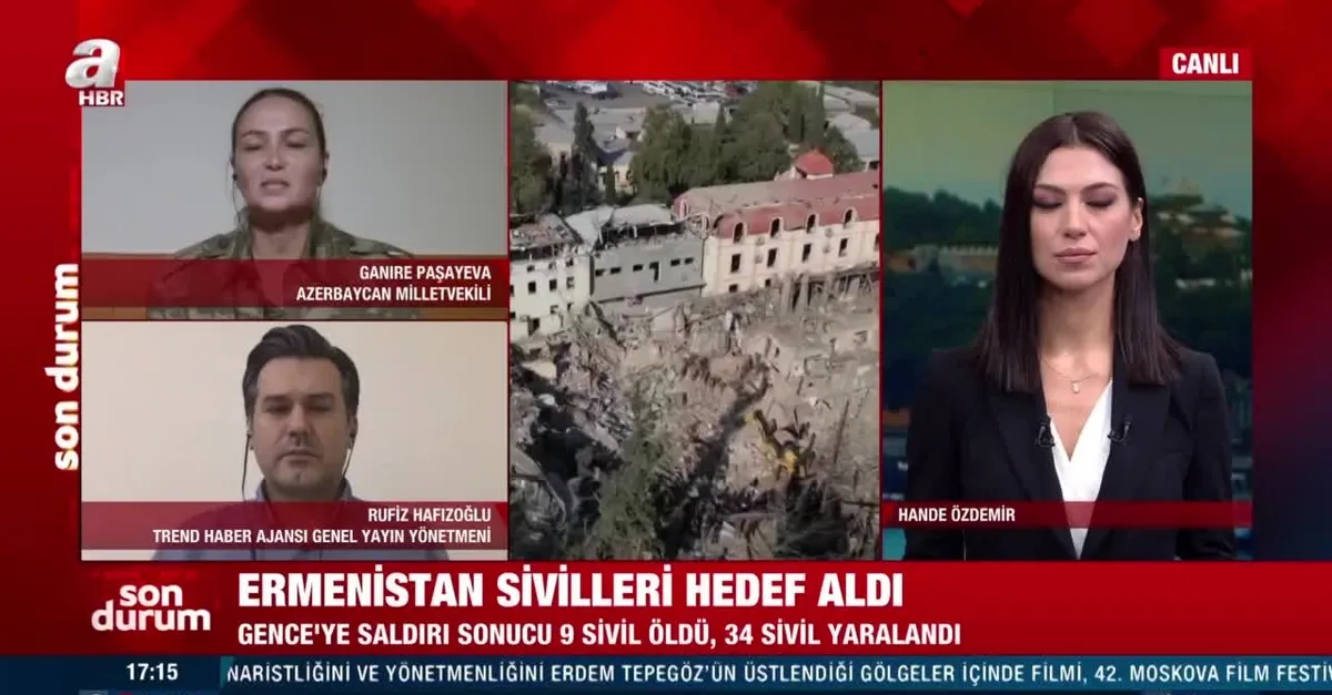 Azerbaycan Milletvekili Ganire Paşayeva, Ermenistan'ın alçakça Azerbaycan'nın 2. büyük şehri olan Gence'ye düzenlediği saldırı sonrasında A Haber'e konuştu. Paşayeva Ermenistan’ın yaptığı insanlık dışı saldırıların Hocalı’dan sonra bir soykırım daha olduğunu söyledi. Paşayeva ayrıca Bakü'nün alçakça saldırıya nasıl karşı nasıl bir cevap vereceğini ve Ermenistan'ın ateşkesi neden ihlal ettiğini değerlendirdi.