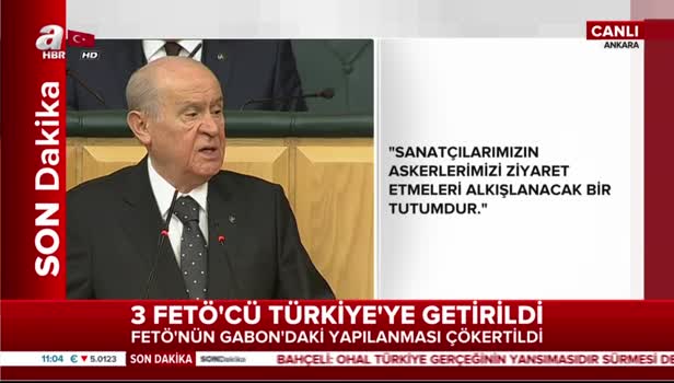 Milliyetçi Hareket Partisi Genel Başkanı Devlet Bahçeli, partisinin TBMM grup toplantısında açıklamalarda bulundu. Gündeme ilişkin açıklamalar yapan Bahçeli, Kılıçdaroğlu'na yüklendi. CHP Genel Başkanı için "CHP liderinin; sanatçıların, Afrin'de destan yazan Mehmetçiğe moral ziyaretini en hakaretamiz ifadelerle eleştirmesi akıl tutulması, ahlak kırılmasıdır. Cumhurbaşkanı kamuflaj giyip sanatçılarla birlikte sınır karakolumuza gitmişken, Sayın Kılıçdaroğlu da mekaplarını ayağına geçirip, terörist kıyafetlerini üzerine giyip doğruca PKK/PYD/YPG tünellerinde soluğu alabilir, arkadaşlarıyla çay partili, bol bol ihanet anısıyla dolu akşamlarda hasret giderebilir." dedi.
