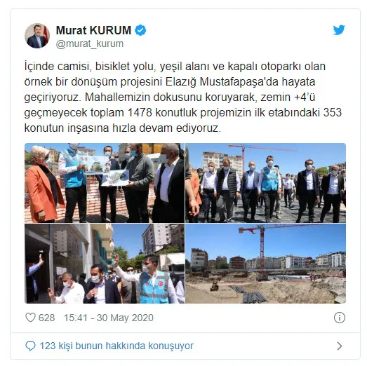 24 Ocak'ta Elazığ'da meydana gelen depremin ardından 1 ay boyunca şehirde enkaz kaldırma ve hasar tespit çalışmalarını takip eden Bakan Kurum, Elazığ'ın yeniden ihya ve inşası sürecinde inşaat kalitesinden hiçbir şekilde ödün verilmeyeceğini, aynı acıları yaşanmaması adına vatandaşları sağlam ve güvenli yuvalarına kavuşturmak için çalışmaya kararlılıkla devam edeceklerini belirtti.