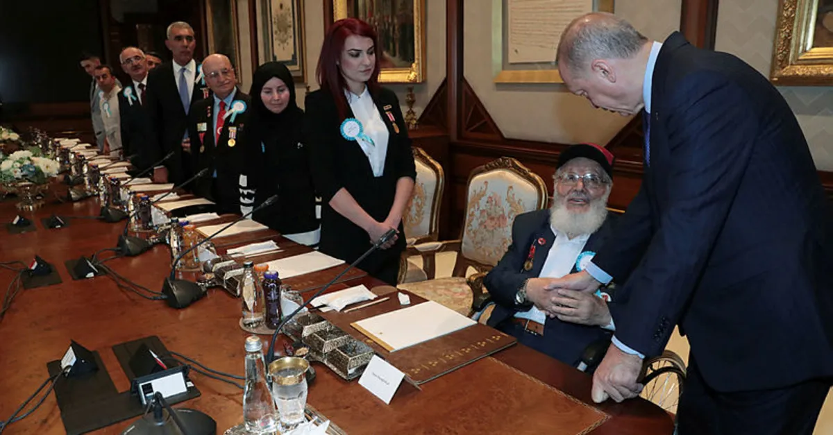 Başkan Erdoğan, 19 Eylül Gaziler Günü nedeniyle Aile, Çalışma ve Sosyal Hizmetler Bakanı Zehra Zümrüt Selçuk ve beraberindeki gazileri Cumhurbaşkanlığı Külliyesinde kabul etti.
