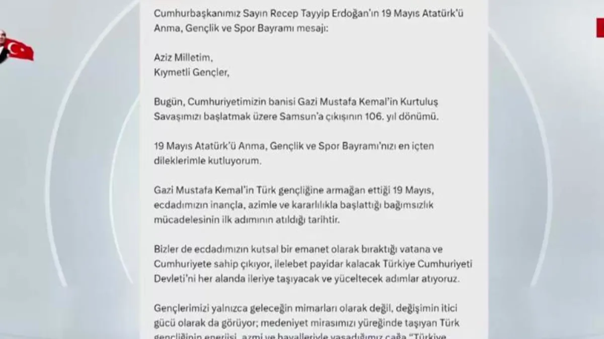 Başkan Recep Tayyip Erdoğan, 19 Mayıs Atatürk’ü Anma, Gençlik ve Spor Bayramı kapsamında yayımladığı mesajda "Terörsüz Türkiye" vurgusu yaptı. "Türkiye Cumhuriyeti'ni yüceltecek adımlar atıyoruz" diyen Erdoğan, "Gençlerimize müreffeh bir ülke bırakmak için bütün gücümüzle çalışıyoruz" ifadelerini kullandı. Başkan Erdoğan, ecdadından devraldığı medeniyet mirasını daha da yüceltmek isteyen her bir genci desteklemeye devam edeceklerini söyledi.