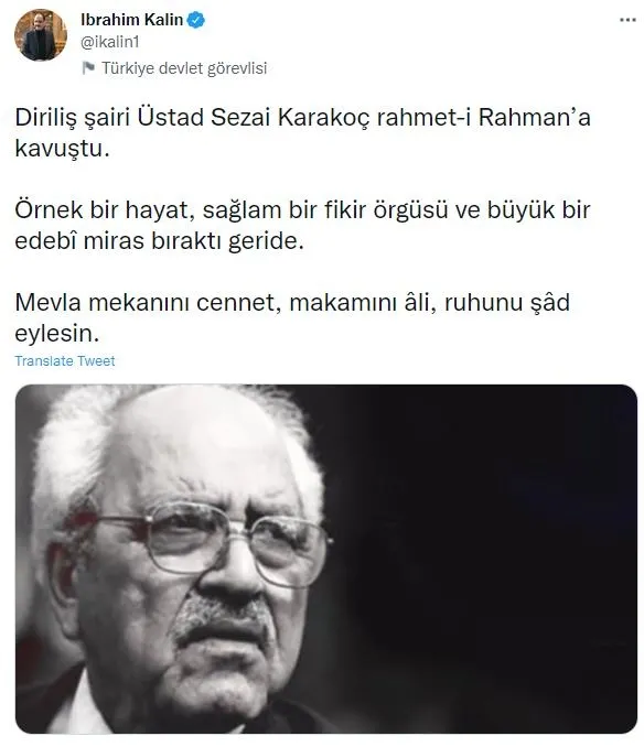Kalın paylaştığı mesajında, "Diriliş şairi Üstad Sezai Karakoç rahmet-i Rahman'a kavuştu. Örnek bir hayat, sağlam bir fikir örgüsü ve büyük bir edebî miras bıraktı geride. Mevla mekanını cennet, makamını âli, ruhunu şâd eylesin." ifadelerine yer verdi.
