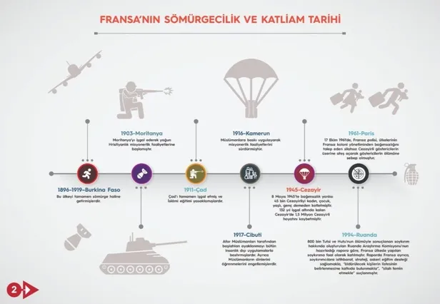 1916 Kamerun, müslümanlara baskı uyguladılar. Cibuti'de ayaklanmayı insanlık dışı uygulamayla bastırdılar. Ayrıca müslümanların dinlerini öğrenmelerini öğrendiler. 1945 yeniden Cezayir. Bağımsızlık yanlısı 45 bin Cezayirliyi kadın, yaşlı, çocuk demeden katlettiler, 1,5 milyon Cezayirli hayatını kaybetti. 1961 Paris. 17 Ekim 1961'de Fransız polisi ülkelerinin Fransız koloni yönetiminden bağımsızlığı talep eden silahsız Cezayirlilerin ölümüne sebep oldu. Ruanda, 800 bin Tutsi'nin ölümüyle sonuçlanan soykırımı.