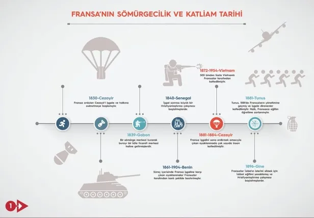 Vietnamlılar Fransızlar tarafından katledildi. 1881-1884 çok sayıda insan katledilmiştir. Yerli kanunu adı verilen zulüm kanunları uygulamaya geçirilmiştir. 1881 Tunus. Fransızların yönetimine geçen Tunus'ta işgale direnenler katledildi, halk Fransızca eğitim öğretime başlatıldı. Fransızlar İslamın izlerini silmek için İslami eğitimini yasakladılar. Macron bunları bilmez. Macron'a söyledim, 'Sen daha siyasette yenisin' dedim. Bunları bir defa iyi öğrenmesi lazım.