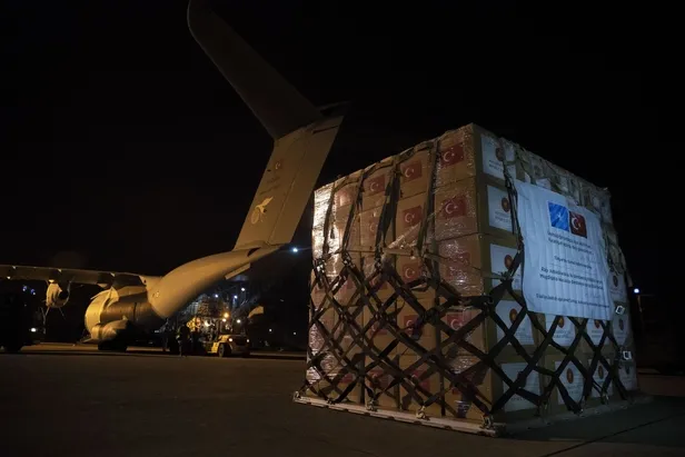 Ay yıldızlı al bayrak ve Cumhurbaşkanlığı forslarının yapıştırıldığı kolilerin içinde 10 solunum cihazının yanı sıra tulum ve maske gibi diğer tıbbi ekipmanlar da vardı.