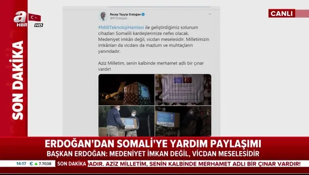 Erdoğan mesajında "#MilliTeknolojiHamlesi ile geliştirdiğimiz solunum cihazları Somalili kardeşlerimize nefes olacak. Medeniyet imkân değil, vicdan meselesidir. Milletimizin imkânları da vicdanı da mazlum ve muhtaçların yanındadır. Aziz Milletim, senin kalbinde merhamet adlı bir çınar vardır!" ifadelerine yer verdi.