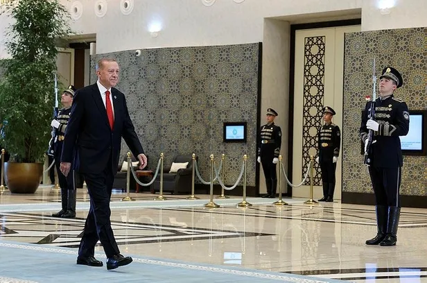 Başkan Erdoğan, "Ebedi Şehir" Kongre Merkezi'ne gelişinde Mirziyoyev tarafından karşılandı.