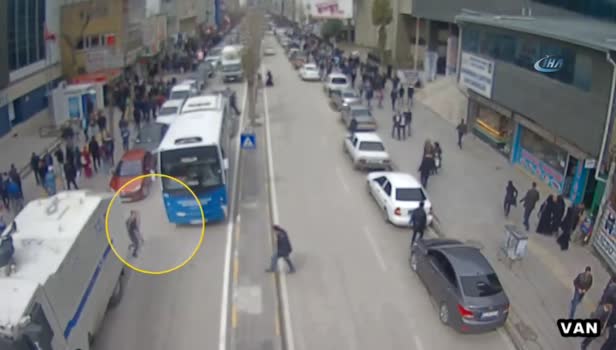 Van'da yolun karşısına koşarak geçmeye çalışırken midibüsün çarptığı şahıs ile aynı noktada kırmızı ışıkta geçen iki aracın karıştığı trafik kazaları güvenlik kameralarına yansıdı.