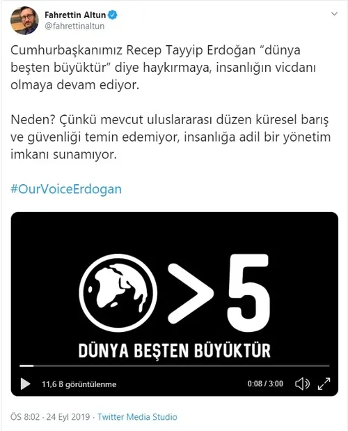 "BM'de BM'ye meydan okuyan lider" alt yazısıyla paylaşılan videoyu Altun, şu sözlerle tamamladı: "Cumhurbaşkanımız Recep Tayyip Erdoğan "dünya beşten büyüktür" diye haykırmaya, insanlığın vicdanı olmaya devam ediyor.