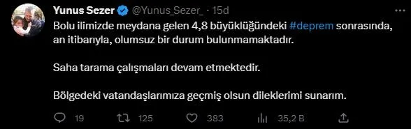 Sezer, sosyal medya hesabından yaptığı paylaşımda, "Bolu ilimizde meydana gelen 4,8 büyüklüğündeki deprem sonrasında, an itibarıyla olumsuz bir durum bulunmamaktadır. Saha tarama çalışmaları devam etmektedir. Bölgedeki vatandaşlarımıza geçmiş olsun dileklerimi sunarım." ifadelerini kullandı.