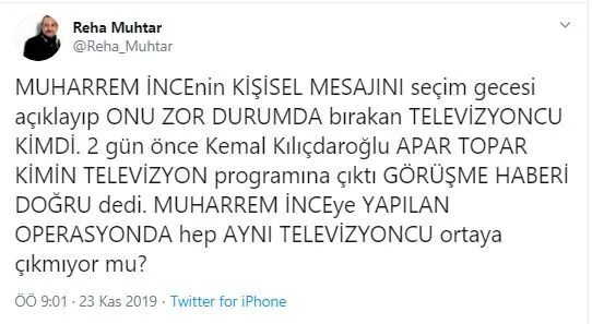 Deneyimli gazeteci Reha Muhtar, Muharrem İnce ile ilgili çıkan haberlere, "İnce'ye operasyon" olarak niteledi. Muhtar ismini vermedi ama açıkça İsmail Küçükkaya'yı tarif etti.