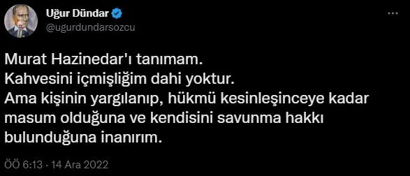 CHP yandaşı Sözcü yazarı Uğur Dündar, yolsuzluklarla anılan ve dün yakalanan eski Beşiktaş Belediye Başkanı Murat Hazinedar hakkındaki rüşvet ve yolsuzluk iddiaları gündeme geldiğinde"Allah herkesi kuru iftiradan korusun" ifadelerini kullanmıştı.