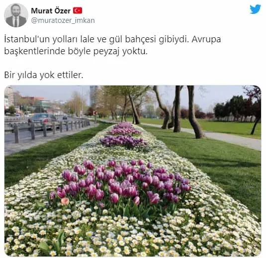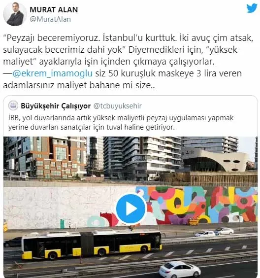Yeni Akit Yazarı Murat Alan: "Peyzajı beceremiyoruz. İstanbul'u kurttuk. İki avuç çim atsak, sulayacak becerimiz dahi yok" Diyemedikleri için, "yüksek maliyet" ayaklarıyla işin içinden çıkmaya çalışıyorlar. Ekrem İmamoğlu siz 50 kuruşluk maskeye 3 lira veren adamlarsınız maliyet bahane mi size..