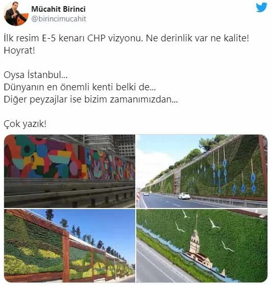 AK Parti eski Grup Başkan Vekili Mücahit Birinci AK Parti ve CHP dönemini karşılaştıran 4 kare paylaşarak "İlk resim E-5 kenarı CHP vizyonu. Ne derinlik var ne kalite! Hoyrat! Oysa İstanbul... Dünyanın en önemli kenti belki de...Diğer peyzajlar ise bizim zamanımızdan... Çok yazık!" ifadelerini kullandı.