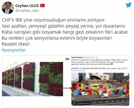 Ceyhan Ulus: CHP'li İBB yine vizyonsuzluğun sınırlarını zorluyor. Sesi azaltan, yemyeşil güzelim peyzaj yerine, yol duvarlarını Küba varoşları gibi boyamak hangi gezi zekalının fikri acaba! Bu renkleri çok seviyorlarsa evlerini böyle boyasınlar! Rezalet ötesi!