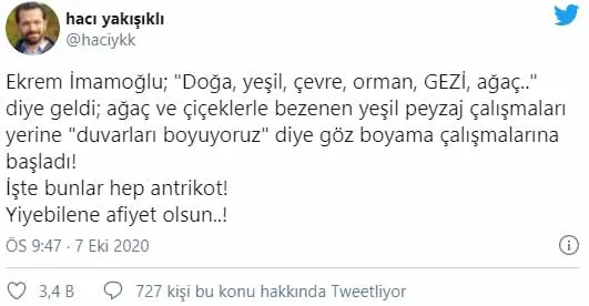 Yeni Akit Gazetesi Ankara Temsilcisi Hacı Yakışıklı: Ekrem İmamoğlu; "Doğa, yeşil, çevre, orman, GEZİ, ağaç.." diye geldi; ağaç ve çiçeklerle bezenen yeşil peyzaj çalışmaları yerine "duvarları boyuyoruz" diye göz boyama çalışmalarına başladı! İşte bunlar hep antrikot! Yiyebilene afiyet olsun..!