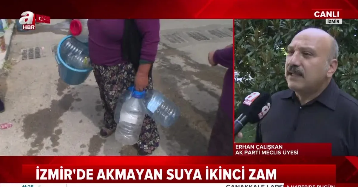 Şehrin birçok noktasına su veremeyen ve vatandaşları denizden su taşımak zorunda bırakan CHP'li İzmir Büyükşehir Belediyesi suya bir kez daha zam yaptı. A Haber muhabiri Sefer Ayçe, canlı yayından aktardı. İzmir Büyükşehir Belediyesi AK Parti meclis üyesi Erhan Çalışkan, canlı yayında perde arkasını anlattı.