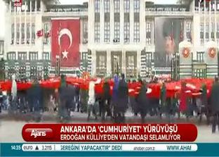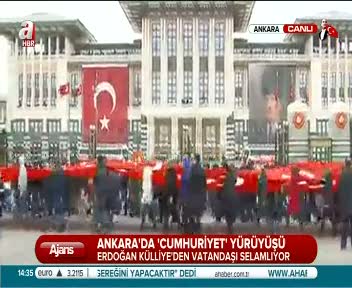 Cumhurbaşkanı Recep Tayyip Erdoğan, Cumhurbaşkanlığı Külliyesi'nin balkonundan 'Cumhuriyet Yürüyüşü' yapan vatandaşlara seslendi.
