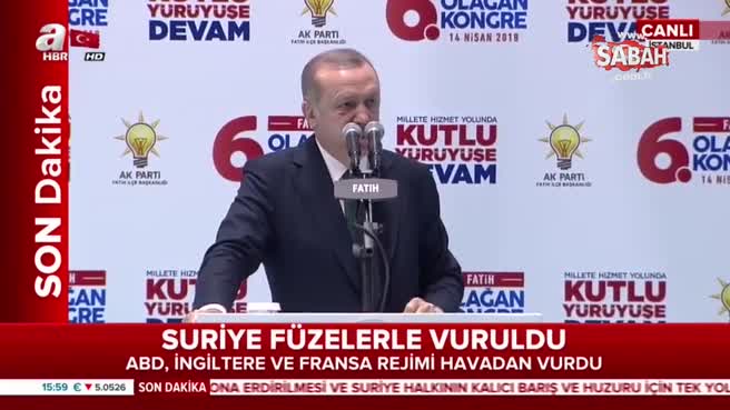 Son dakika haberi... Cumhurbaşkanı ve AK Parti Genel Başkanı Recep Tayyip Erdoğan, partisinin Fatih 6. Olağan İlçe Kongresi öncesinde kendisini bekleyen vatandaşlara hitap etti. Cumhurbaşkanı Erdoğan burada yaptığı açıklamaların ardından kongre salonuna geçti. Cumhurbaşkanı Erdoğan, Suriye operasyonuna ilişkin şu ifadeleri kullandı: "Son günlerde rejimin kimyasal saldırısının ardından ABD ve Rusya'nın başını çektiği restleşmeye şahit olduk. Bu sabah rejim hedeflerine operasyon yapıldı. Onun için bu gece de uykusuz geçti. Rejimin daha önce de çeşitli defalar yaptığı bu tür saldırıların cevapsız bırakılması düşünülemezdi. Bu bakımdan operasyonu doğru buluyoruz. Kimse bu kimyasal saldırının faili bedelini ödemesi lazım. Ancak kimyasal saldırıya düzenlenen bu hassasiyetin konvansiyonel silahlarla katledilen yüz binlerce masum sivil için de gösterilmesini istiyoruz."