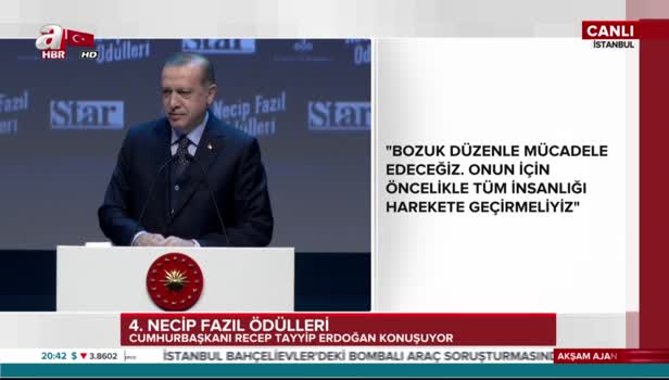 İstanbul'da 4. Necip Fazıl Ödül Töreni'nde konuşan Cumhurbaşkanı Erdoğan, Necip Fazıl Kısakürek'in 'Müjde' şiirini okudu.