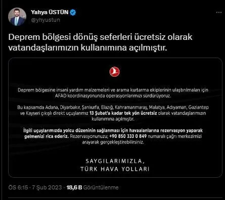18.16: Türk Hava Yolları, Adana, Diyarbakır, Şanlıurfa, Elazığ, Kahramanmaraş, Malatya, Adıyaman, Gaziantep ve Kayseri çıkışlı direkt uçuşların 13 Şubat'a kadar tek yön ücretsiz olacağını duyurdu.
