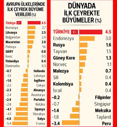 Türkiye ekonomisi yılın ilk çeyreğinde koronavirüs salgınına rağmen yüzde 4.5 büyüdü. Dünya ekonomisinin daralmaya gittiği bu dönemde Türkiye, ekonomisiyle büyük bir başarı kaydetti ve büyüme rakamıyla şu ana kadar veri açıklayan tüm ülkeleri geride bıraktı.