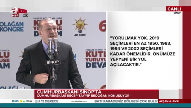 Sinop'ta coşkulu kalabalığa seslenen Cumhurbaşkanı Recep Tayyip Erdoğan, "Biz diğer partiler gibi asla olamayız. Biz ana muhalefet gibi 3 kuruşluk menfaat için ülke ve millet düşmanlarına payandalık yapamayız. Bizim hamdolsun kimseye diyet borcumuz yok. Bizim medya baronlarına, terör ağalarına, siyaset mühendislerine minnet borcumuz yok" dedi.