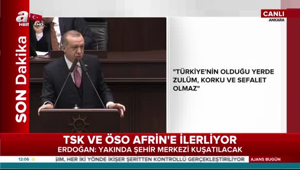 Partisinin grup toplantısında konuşan Cumhurbaşkanı Erdoğan, "Terör örgütünün adını eğip bükerek itiraf ettikleri gibi onlar üzerinde imaj çalışması yaparak gerçekleri gizlediklerini sananlar sadece kendilerini kandırıyorlar. Sınırlarımız boyunca ve sınırlarımız içinde başınıza musallat edilen terör örgütlerinin ALLAH'ın izniyle hakkından geliriz." dedi.