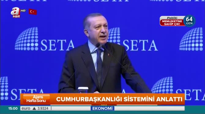 Cumhurbaşkanı Recep Tayyip Erdoğan, SETA'nın düzenlediği Cumhurbaşkanlığı Sempozyumu'nda önemli mesajlar verdi. Cumhurbaşkanlığı sisteminin tek adamlıkla, şahsilikle ilgisi olmadığını belirten Erdoğan, "Bugün hayır diyenler neye hayır dediklerinin farkında mı? PKK, HDP ve bölücüler hayır diyor. Ana muhalefet 16 Nisan'a kadar inşallah kendini çek eder" dedi.
