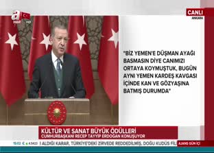Cumhurbaşkanı Recep Tayyip Erdoğan, Cumhurbaşkanlığı Külliyesi'nde düzenlenen Kültür ve Sanat Büyük Ödülleri programında konuştu. Trump'ın Kudüs tehdidine sert tepki gösteren Cumhurbaşkanı Erdoğan "Dolarla irademizi satın alamazsın" dedi...
