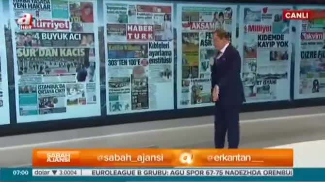 A Haber ekranlarında hafta içi 'Sabah Ajansı' programını sunan Erkan Tan Hürriyet gazetesinin manşetine sert tepki gösterdi. Tan, düşürülen Rus uçağındaki pilotu öldürdüğü iddia edilen Alparslan Çelik'in haberini veriş tarzını eşleştirdi.