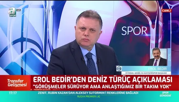 Transfer döneminde flaş gelişmeler yaşanmaya devam ediyor. 3 büyük kulüple adı anılan Kayserisporlu futbolcu Deniz Türüç'ün transfer dedikodularına Kayserispor Başkanı Erol Bedir açıklık getirdi. A Spor'a özel açıklamalarda bulunan Kayserispor Başkanı Erol Bedir, "Görüşmeler sürüyor ama anlaştığımız bir takım yok." ifadelerini kullandı.