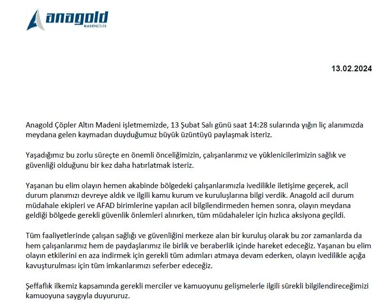 "Meydana gelen kaymadan duyduğumuz büyük üzüntüyü paylaşmak isteriz. Yaşanan bu elim olayın hemen akabinde bölgedeki çalışanlarımızla ivedilikle iletişime geçerek, acil durum planımızı devreye aldık ve ilgili kamu kurum ve kuruluşlarına bilgi verdik. Anagold acil durum müdahale ekipleri ve AFAD birimlerine yapılan acil bilgilendirmeden hemen sonra, olayın meydana geldiği bölgede gerekli güvenlik önlemleri alınırken, tüm müdahaleler için hızlıca aksiyona geçildi. Tüm faaliyetlerinde çalışan sağlığı ve güvenliğini merkeze alan bir kuruluş olarak bu zor zamanlarda da hem çalışanlarımız hem de paydaşlarımız ile birlik ve beraberlik içinde hareket edeceğiz. Yaşanan bu elim olayın etkilerini en aza indirmek için gerekli tüm adımları atmaya devam ederken, olayın ivedilikle açığa kavuşturulması için tüm imkanlarımızı seferber edeceğiz. Şeffaflık ilkemiz kapsamında gerekli merciler ve kamuoyunu gelişmelerle ilgili sürekli bilgilendireceğimizi kamuoyuna saygıyla duyururuz."