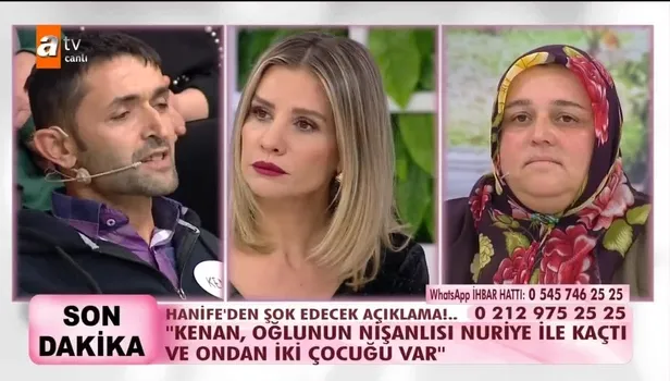 Atv ekranlarında yayınlanan Esra Erol'da programında şoke eden bir gelişme yaşandı. 30 Aralık Pazartesi günü yayınlanan bölümde Hanife Hanım eşi Kenan Bey’in oğlunun nişanlısı ile kaçtığını iddia etti.