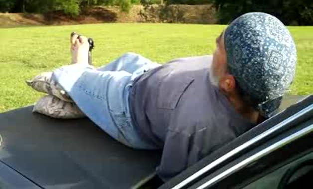 Kolları olmayan bu adam ayaklarıyla tabanca kullanıyor. Ayak parmaklarının arasına aldığı tabancayla nişan alıyor, tetiğe basıyor, mermisi bitince şarjörünü de yine ayak parmaklarıyla dolduruyor.