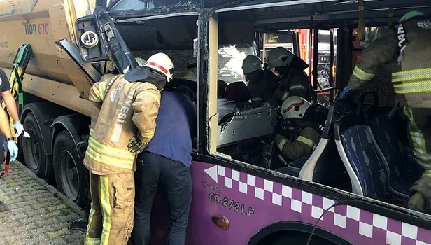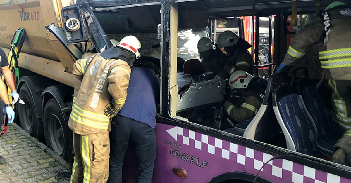 Sancaktepe'de sürücüsünün direksiyon hakimiyetini kaybettiği özel halk otobüsü park halindeki hafriyat kamyonuna çarparak durabildi. Şoför mahallinde sıkışan sürücü, itfaiye ekiplerinin bir saatlik çalışmasının ardından kurtarıldı.