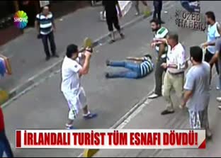 Aksaray'da bir otele yerleşen İrlandalı turist, su almak için markete gitti. Dolabı hızlı açtığı için tüm suları yere döken İrlandalı turiste, market sahibi sopayla vurunca kavgaya tüm esnaf karıştı.