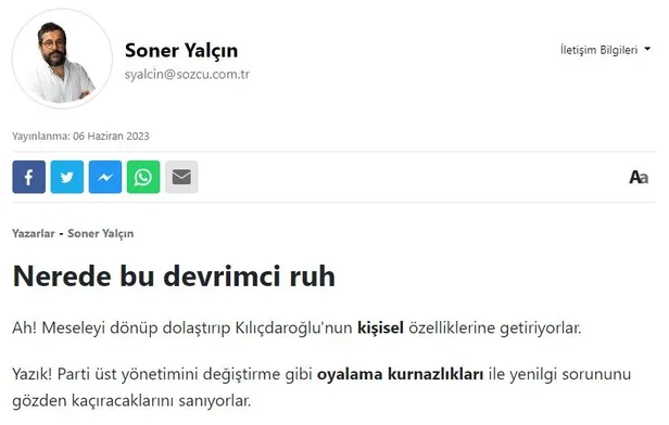 İşte Soner Yalçın'ın CHP yandaşı Sözcü'de kaleme aldığı o yazı: