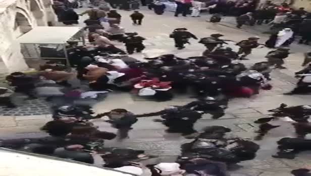 İşgalci terörist devlet İsrail'in askerleri Kudüs'te; kadın, çocuk, yaşlı demeden Filistinlilere saldırdı. Masum halkın üzerine gözü dönmüş bir şekilde saldıran alçak askerler, Filistinli Müslümanları yerlerde sürükleyerek gözaltına aldı. İşte o anlar...
