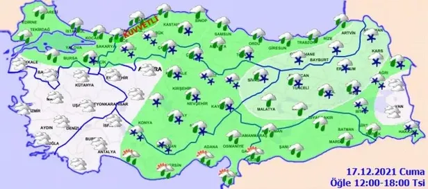 Son dakika hava durumu açıklandı. Meteoroloji Genel Müdürlüğü tarafından yapılan son değerlendirmelere göre: Ülkemiz genelinin çok bulutlu, Güney Ege ile Antalya, Burdur ve Isparta çevreleri hariç tüm yurdun yağışlı geçeceği tahmin ediliyor. Yağışların; kıyı kesimler ile Doğu Akdeniz ve Güneydoğu Anadolu'da yağmur ve sağanak, yağış alan diğer yerlerde karla karışık yağmur ve Kar şeklinde olması bekleniyor. Yağışların; Düzce, Zonguldak, Bartın, Batman, Siirt ve Hakkâri çevrelerinde kuvvetli yağmur ve sağanak, 900 metre üzeri rakımlı kesimlerde kuvvetli karla karışık yağmur ve yer yer yoğun kar şeklinde olması bekleniyor.
